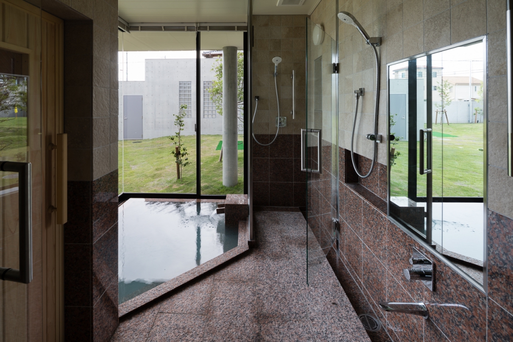 浴室は、ゴルフ場に向かってガラス張りとし、窓際にオーバーフローを設ける納まりとしたことで、水面とグリーンが連続するように計画している。